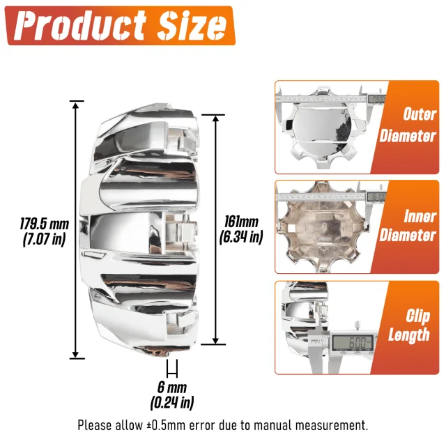 ⚙ Size:Outer Diameter: 179.5mm/7.07in, Inner Diameter: 161mm/6.34in , Clip Length: 6mm/0.24in.